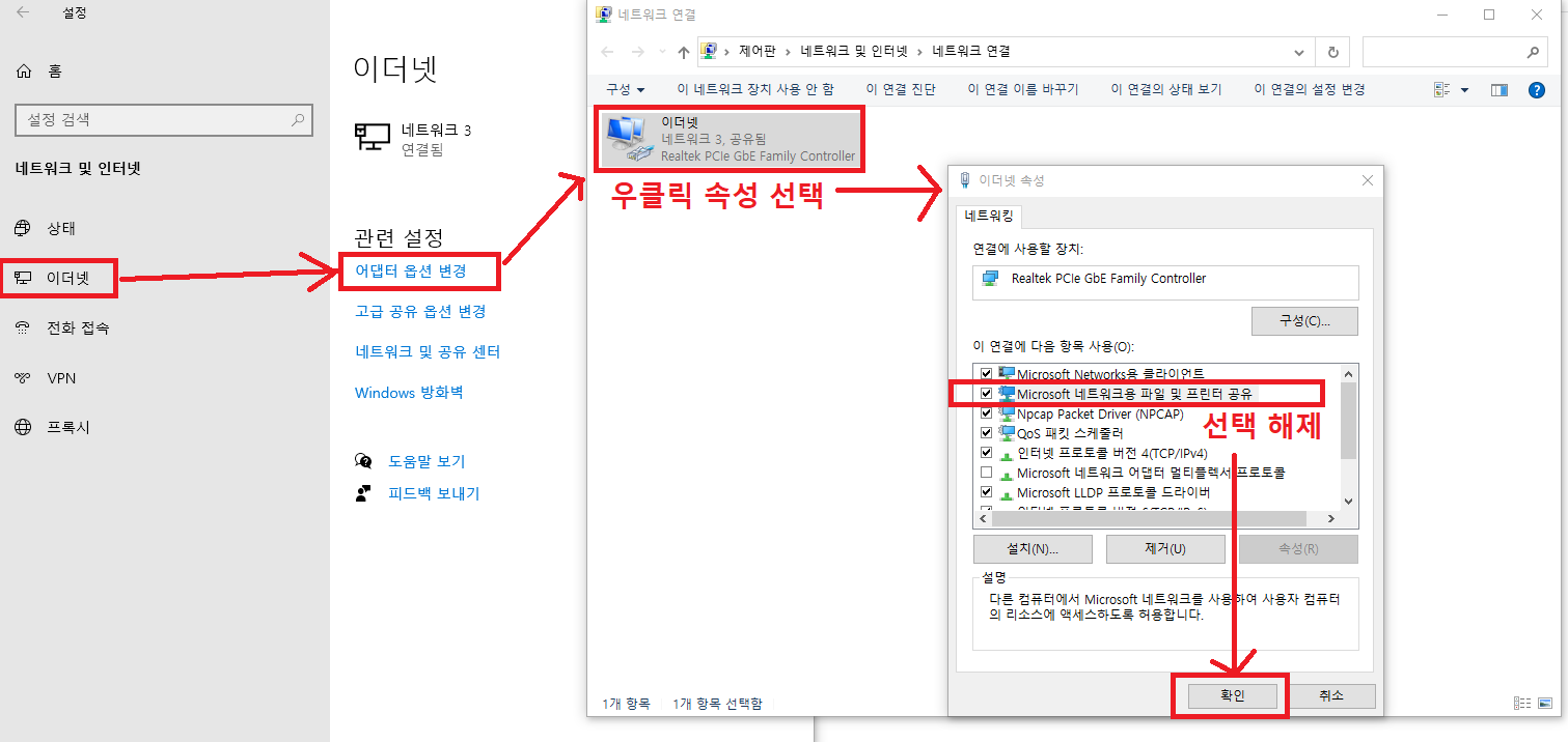 2. 설정창에서 이더넷 > 아댑터 옵션 변경 > 이더넷 우클릭 속성 선택 > 속성 에서 Microsoft 네트워크요 파일 및 프린터 공유 체크 해제 > 확인 클릭
