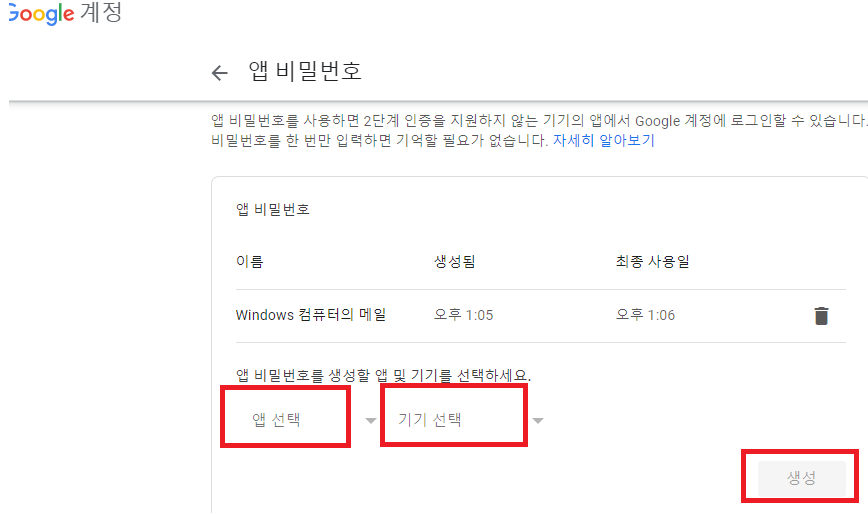 5) 앱 선택 : 메일, 기기 선택 : windows 컴퓨터, 생성 클릭 하면 16자리 비밀번호가 생성된다.