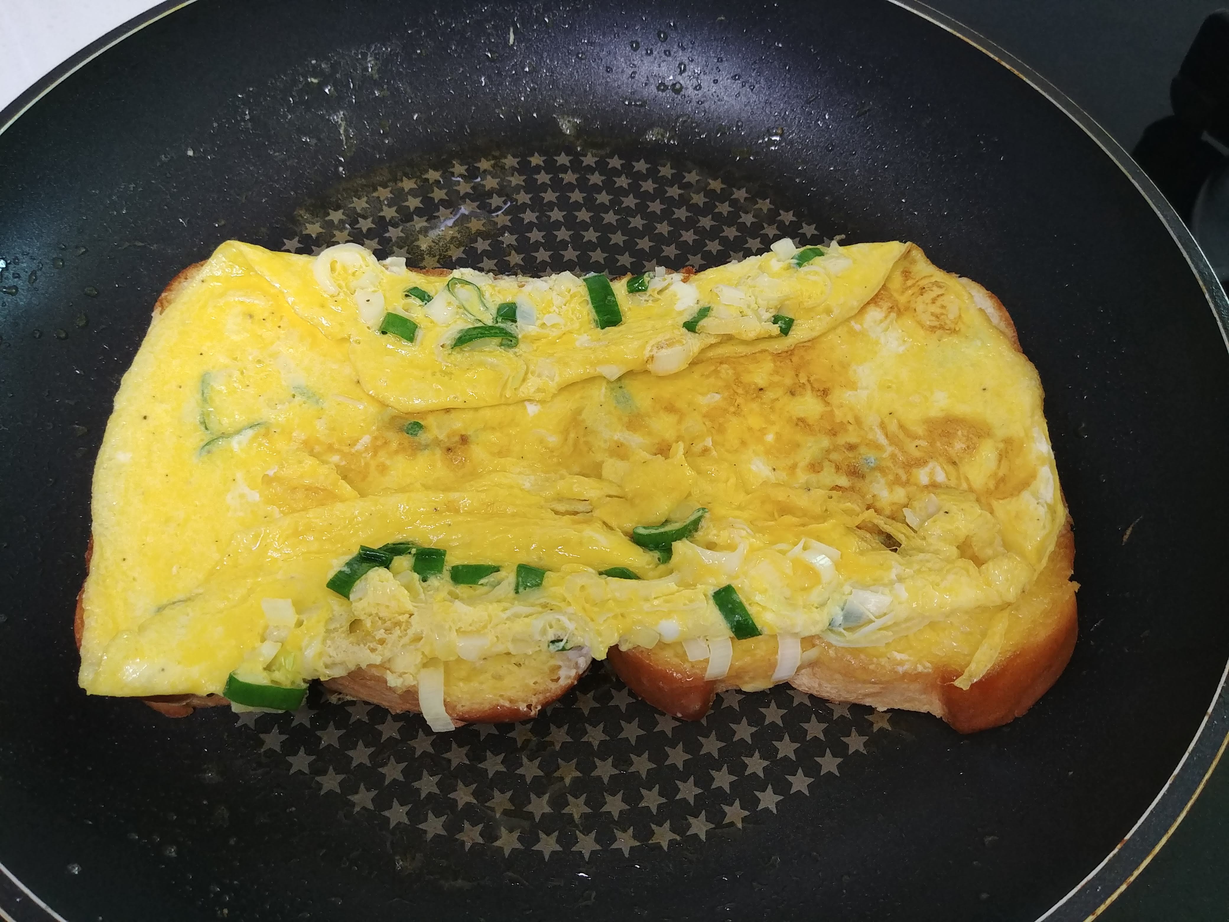 적당히 계란이 익으면 식빵 두장을 올려주세요.