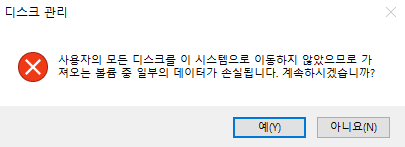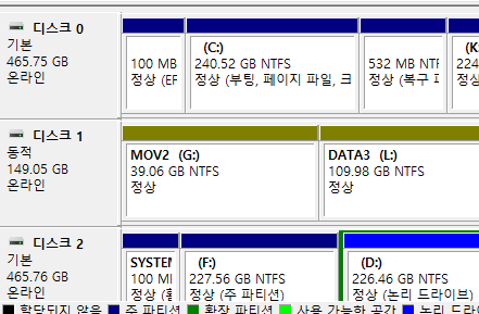 저장소 밑에 디스크 관리 클릭하면 아래와 같이 동적 외부 디스크가 보인다.