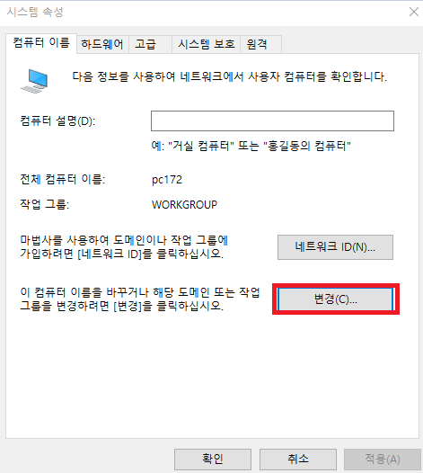 설정 변경을 클릭하여 컴퓨터 이름을 영문으로 변경하고 PC를 재시작하면 정상 작동된다.