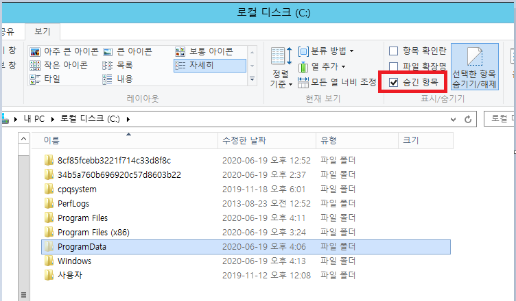 보기탭에서 숨긴 항목 체크해주면 보인다.