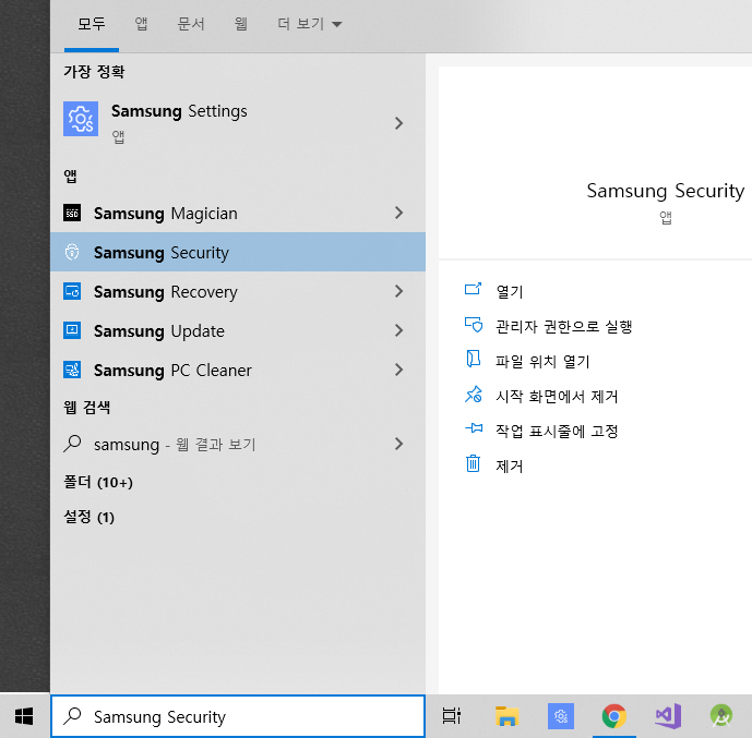 윈도우 하단 검색창에 samsung 이라고 치면 삼성 앱이 아래처럼 여러 개 나온다.