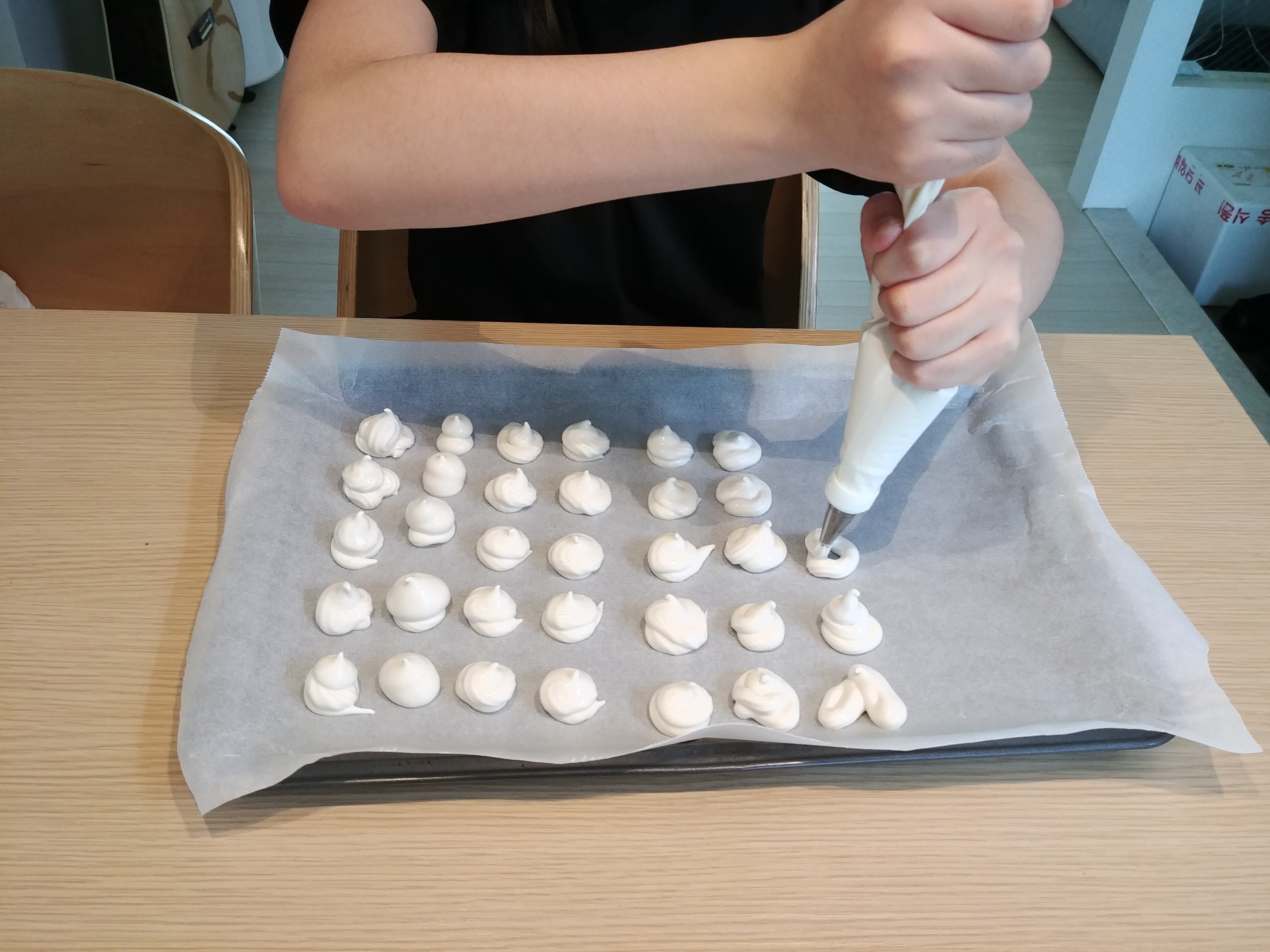 9. 종이호일 위에 이쁘게 머랭쿠키를 짜 놓습니다. 모양이 안습..이네요..