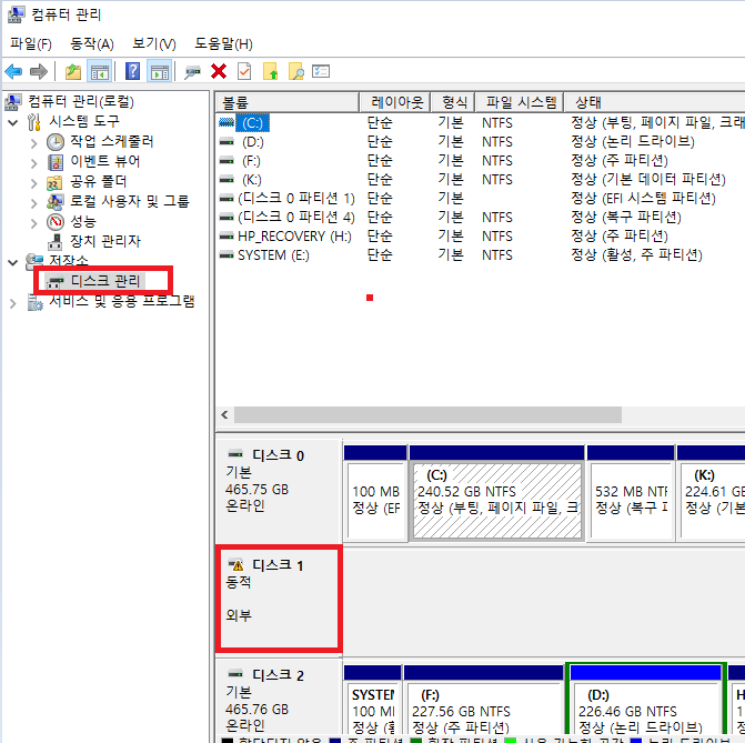 저장소 밑에 디스크 관리 클릭하면 아래와 같이 동적 외부 디스크가 보인다.