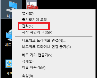 내 pc 아이콘을 우클릭하고 "관리" 클릭한다.