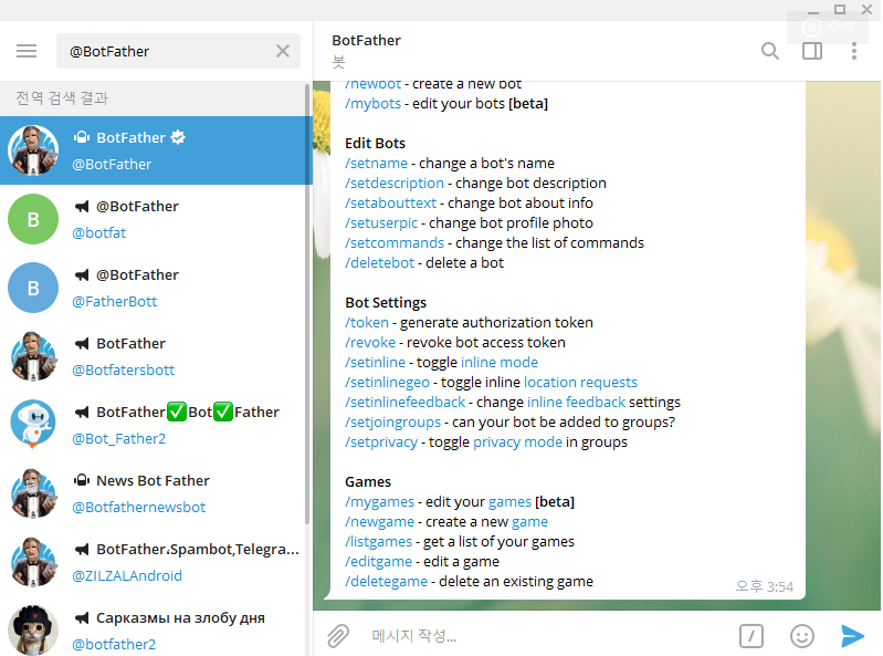 맨 위에 검색된 BotFather를 선택하고